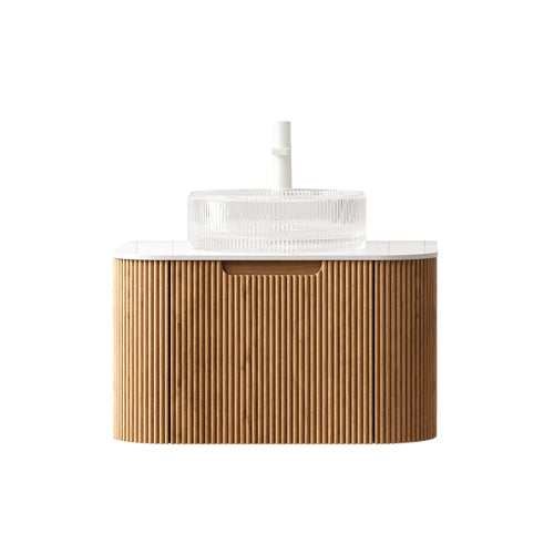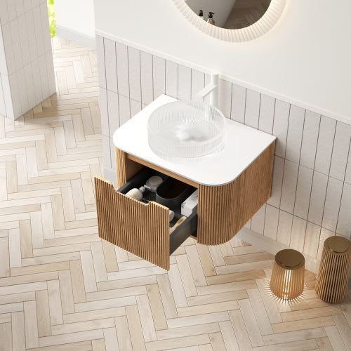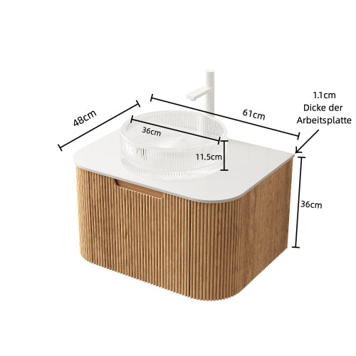 Product Name: DINA 61cm Hängender Badezimmer-Waschtisch (Transparentes rundes Glasbecken + Weiße Arbeitsplatte + Vormontiertem Gestreiftem Sperrholzschrank mit Schublade, Natürliche Holzmaserung)